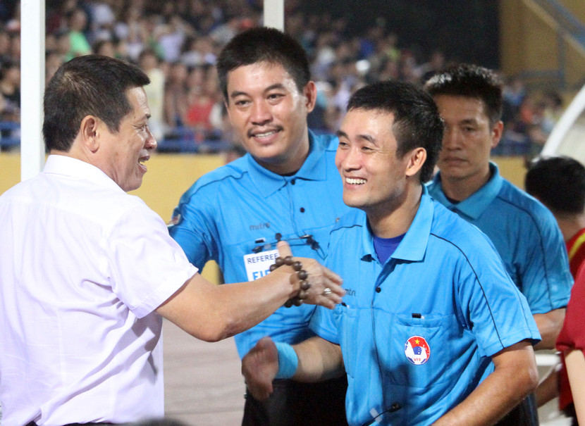 Trợ lý Trần Văn Hải (áo xanh đứng sau) cũng là người duy nhất trong tổ trọng tài không cười và lãnh đạo Ban trọng tài xuống sân bắt tay (Ảnh: Bảo Lâm)