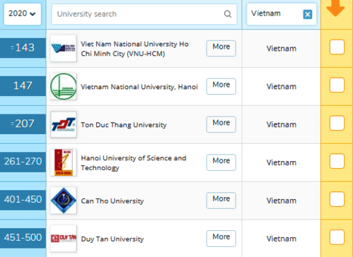 Việt Nam có 8 ĐH và trường ĐH được xếp hạng TOP 500 ĐH tốt nhất trong tổng số 13.578 ĐH và học viện toàn Châu Á. Cụ thể 8 trường đại học này bao gồm: ĐH Quốc gia TP HCM (xếp hạng 143); ĐH Quốc gia Hà Nội (xếp thứ 147), ĐH Bách khoa Hà Nội (thuộc nhóm xếp hạng 261-270), ĐH Tôn Đức Thắng (xếp thứ 207). ĐH Cần Thơ (nằm trong nhóm 401-450) và ĐH Duy Tân, ĐH Huế, ĐH Đà Nẵng (nằm trong nhóm 451-500).