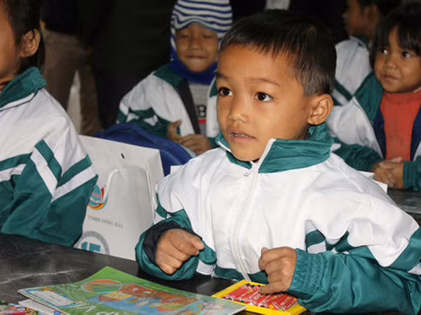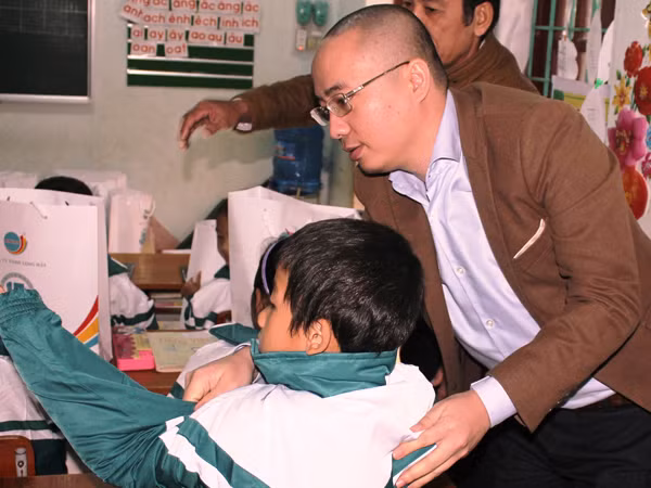 Ông Nguyễn Phan Huy Khôi, Giám đốc Đối ngoại, Tập đoàn Number 1 (Tân Hiệp Phát) mặc áo ấm cho một em nhỏ dân tộc Vân Kiều tại trường Tiểu học Trường Sơn, huyện Quảng Ninh.