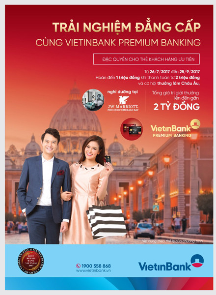 Đặc biệt, trong thời gian triển khai chương trình khuyến mãi, chủ thẻ VietinBank Premium Banking chi tiêu tích lũy từ 50 triệu đồng trở lên còn được tham gia chương trình quay số để có cơ hội nhận được 1 tour du lịch châu Âu nghỉ dưỡng trị giá 200 triệu đồng dành cho 2 người hoặc 1 voucher nghỉ dưỡng cao cấp trị giá 35 triệu đồng dành cho 2 người (2 đêm nghỉ, miễn phí 1 bữa ăn tối sang trọng và dịch vụ spa) tại JW Marriott Phu Quoc Emerald Bay.