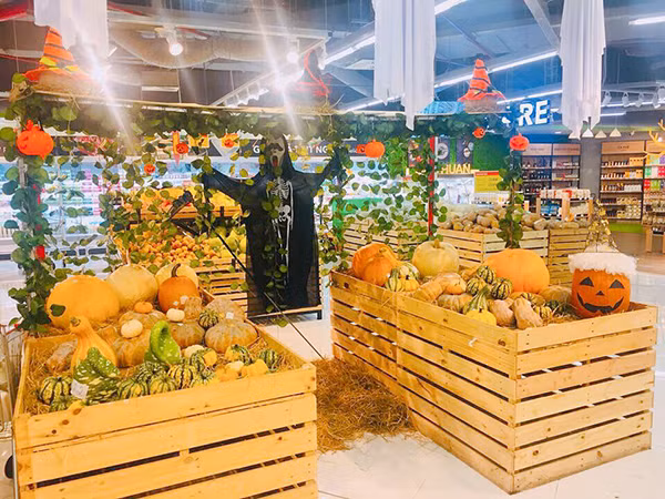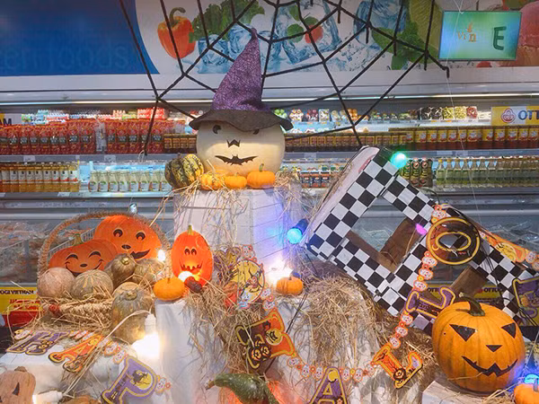 Tiểu cảnh Halloween trong không gian siêu thị tạo nên trải nghiệm mua sắm thú vị với khách hàng tới VinMart và VinMart+.