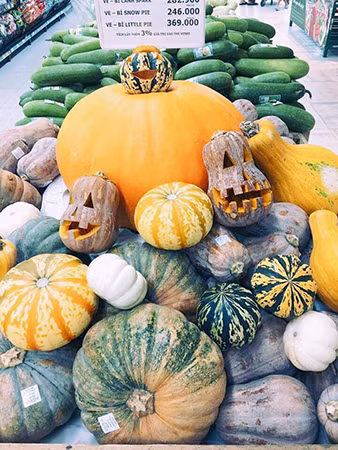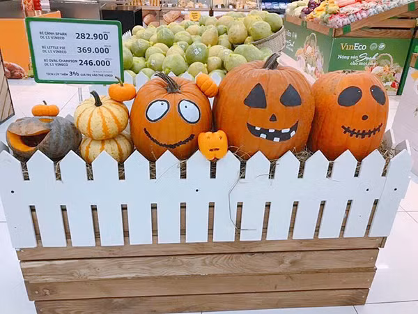 Loại bí ngô thú vị này hiện được trang trí và bày bán tại tất cả các siêu thị VinMart và cửa hàng VinMart+ trên toàn quốc. Trong ảnh là một góc trang trí Halloween ngộ nghĩnh tại siêu thị VinMart Thảo Điền (TP. Hồ Chí Minh)