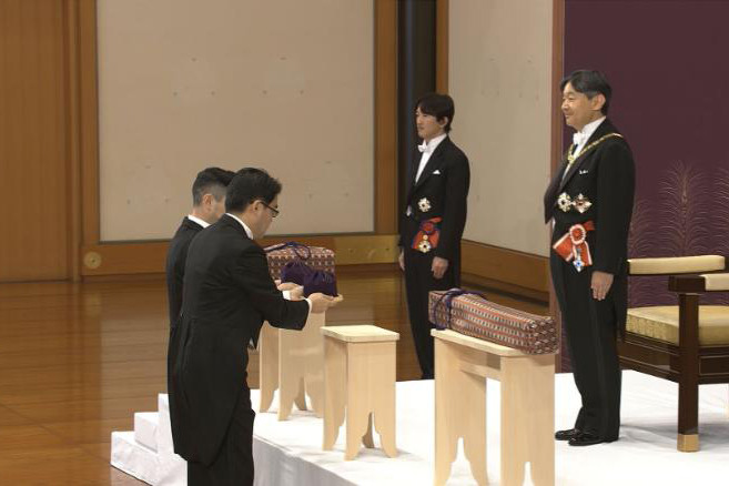 Trong lễ lên ngôi, Nhật hoàng Naruhito, 59 tuổi, được trao ba báu vật thiêng liêng bao gồm thanh gươm Kusanagi no Tsurugi, chiếc gương Yata no Kagami và viên ngọc Yasakani no Magatama, tượng trưng cho lòng dũng cảm, sự khôn ngoan và lòng nhân từ.