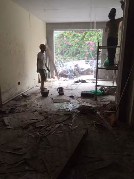 Có mặt tại địa chỉ trên sáng 16-8, chúng tôi ghi nhận trên tầng 2 của ngôi nhà, việc thi công vẫn diễn ra khá gấp rút. Tại đây, một bức tường ngăn được đập đi từ những ngày trước hiện đã được xây lại. Trên trần nhà, chủ nhà đã thêm vào những thanh giằng bằng sắt để gia cố chịu lực.