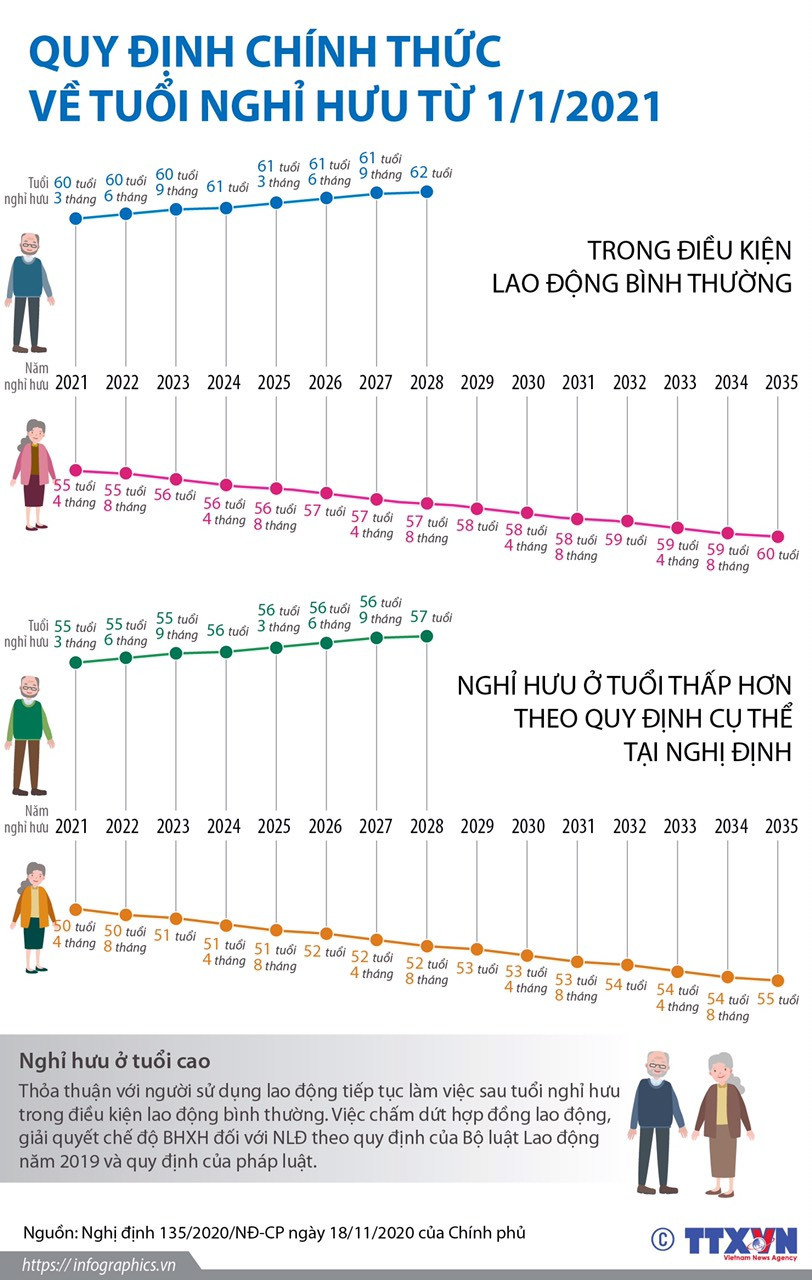 Chính phủ vừa ban hành Nghị định 135/2020/NĐ-CP quy định về tuổi nghỉ hưu đối với cán bộ, công chức, viên chức và người lao động. Theo đó, kể từ ngày 1-1-2021, tuổi nghỉ hưu của người lao động trong điều kiện lao động bình thường là đủ 60 tuổi 3 tháng đối với lao động nam và đủ 55 tuổi 4 tháng đối với lao động nữ. Sau đó, cứ mỗi năm tăng thêm 3 tháng đối với lao động nam cho đến khi đủ 62 tuổi vào năm 2028 và cứ mỗi năm tăng thêm 4 tháng đối với lao động nữ cho đến khi đủ 60 tuổi vào năm 2035.