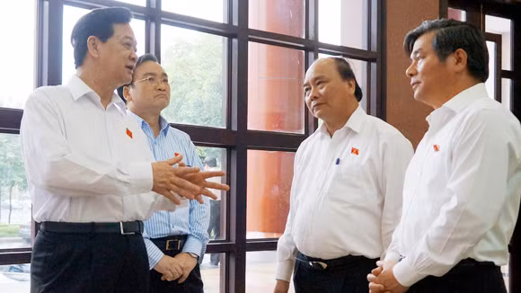 Thủ tướng Nguyễn Tấn Dũng trao đổi bên hành lang Quốc hội chiều 30-5. Ảnh: Phú Khánh