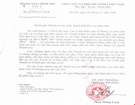 Khẳng định việc chỉ đạo thanh tra các tỉnh mua các tài liệu nói trên là không đúng sự thật, có dấu hiệu lừa đảo, Cục I Thanh tra Chính phủ cho biết, việc mạo danh lãnh đạo các Cục để giới thiệu, chỉ đạo mua tài liệu đang diễn ra ở nhiều địa phương, làm ảnh hưởng tới uy tín của Thanh tra Chính phủ.