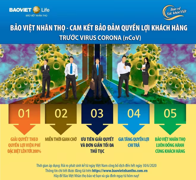 Để hỗ trợ khách hàng kịp thời trong trường hợp không may gặp rủi ro do nhiễm Covid-19, Bảo Việt Nhân thọ còn áp dụng chính sách đặc biệt: chi trả 200% số tiền bảo hiểm của quyền lợi trợ cấp viện phí thông thường đối với khách hàng nằm viện cách ly do nhiễm Covid-19 theo chẩn đoán xác định của cơ quan y tế có thẩm quyền. Dù người nhiễm Covid-19 đã được điều trị và chăm sóc miễn phí theo chính sách của Nhà nước, khi đã tham gia bảo hiểm nhân thọ, khách hàng vẫn được nhận trợ cấp viện phí đặc biệt theo điều khoản và phạm vi của hợp đồng. Đồng thời, Bảo Việt Nhân thọ sẽ miễn thời gian chờ đối với khách hàng nhiễm Covid-19. Trong trường hợp khách hàng phải nằm viện, bị bệnh lý nghiêm trọng hoặc tử vong do nhiễm Covid-19 khi hợp đồng đang có hiệu lực, khách hàng sẽ được xem xét giải quyết quyền lợi bảo hiểm mà không phụ thuộc vào thời gian có hiệu lực của hợp đồng. Bảo Việt Nhân thọ cũng sẽ ưu tiên giải quyết đối với các hồ sơ yêu cầu giải quyết quyền lợi bảo hiểm do nhiễm Covid-19. Thời gian áp dụng chính sách đặc biệt đối với các rủi ro phát sinh kể từ ngày công bố dịch (01/02/2020) đến ngày 30/6/2020.