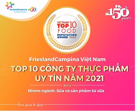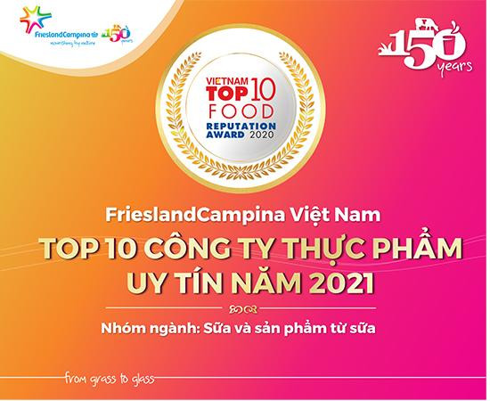 Trong khi đó, dựa vào các kết quả nghiên cứu độc lập của Vietnam Report dành cho các doanh nghiệp ngành thực phẩm - đồ uống, tập đoàn sữa đa quốc gia hàng đầu thế giới FrieslandCampina đã lọt vào “Top 10 Công ty uy tín ngành thực phẩm - đồ uống năm 2021”. Giải thưởng của Công ty cổ phần Báo cáo đánh giá Việt Nam (Vietnam Report) đã dựa trên 3 tiêu chí chính: (1) Năng lực tài chính (2) Uy tín truyền thông (3) Khảo sát ý kiến các đối tượng liên quan (người tiêu dùng, khách hàng…).