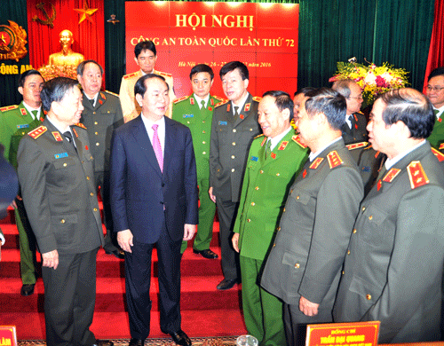 Phát biểu tại Hội nghị, Chủ tịch nước Trần Đại Quang gửi tới toàn thể tướng lĩnh, sỹ quan, hạ sỹ quan, chiến sỹ, công nhân viên toàn lực lượng CAND lời thăm hỏi ân cần. Chủ tịch nước tin tưởng chắc chắn rằng, với bản lĩnh, trình độ, năng lực và sự ủng hộ giúp đỡ của nhân dân, nhất định lực lượng CAND sẽ hoàn thành xuất sắc nhiệm vụ được giao.