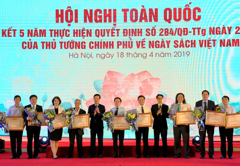 Ủy viên Bộ Chính trị, Bí thư Trung ương Đảng, Trưởng Ban Tuyên giáo Trung ương Võ Văn Thưởng và Phó Thủ tướng Chính phủ Vũ Đức Đam trao bằng khen cho các tập thể, cá nhân đã có thành tích xuất sắc trong việc triển khai thực hiện Quyết định số 284/QĐ-TTg ngày 24/2/2014 của Thủ tướng Chính phủ về Ngày Sách Việt Nam (Ảnh: Quang Vinh)