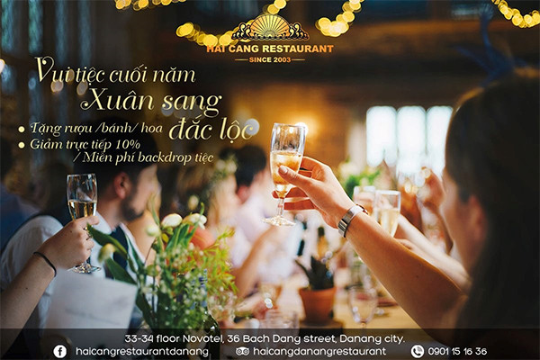 Năm nay, nhà hàng Hải Cảng Đà Nẵng nằm trên tầng 33-34 của khách sạn 5 sao đẳng cấp Novotel Danang Premier Han River dành tặng khách hàng chương trình “Ưu đãi đặt tiệc cuối năm” đầy hấp dẫn. Nhóm khách từ 10 người trở lên sẽ được chọn ngay một trong ba ưu đãi: Tặng miễn phí một bánh kem (nội dung theo yêu cầu) /Tặng một bó hoa hoặc tặng rượu vang miễn phí cho tất cả thực khách. Đặc biệt hơn nữa, với nhóm 12 khách trở lên, bạn còn được lựa chọn giảm ngay 10% hoặc tặng backdrop sân khấu dành riêng cho công ty.
