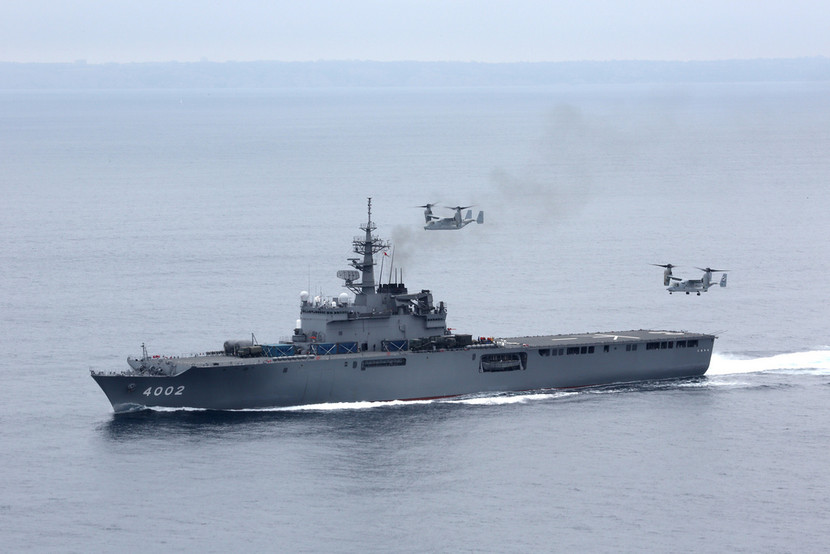 MV-22 Osprey luyện tập cất, hạ cánh trên tàu đổ bộ LST-4002 JS Shimokita lớp Osumi của Nhật, trong khuôn khổ cuộc diễn tập “Tia chớp bình minh 2013” (Dawn Blitz 2013)