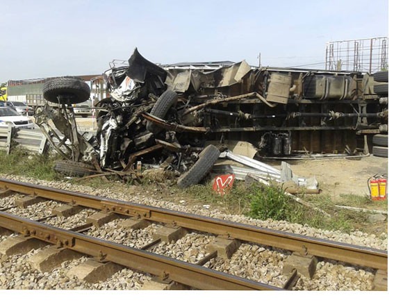 Chiếc xe đang từ từ chạy qua đường sắt, cùng lúc đó tàu hỏa chở khách mang số hiệu NA3 chạy hướng Hà Nội - Vinh lao tới, đâm ngang cabin xe tải. Cú đâm rất mạnh khiến xe tải chở nhựa nát bét, hư hỏng nặng và bị hất văng xuống QL 1A nằm chắn một nửa đường.