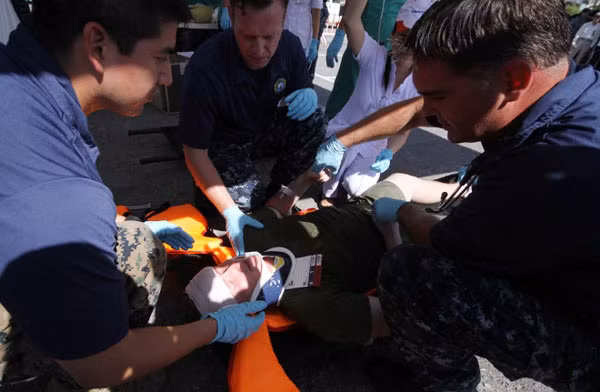 Khi các nạn nhân được chuyển lên bờ, bác sĩ trên tàu Mercy và các bác sĩ thuộc Trung tâm cấp cứu 115 Đà Nẵng lập tức sơ cứu, phân loại bệnh nhân.