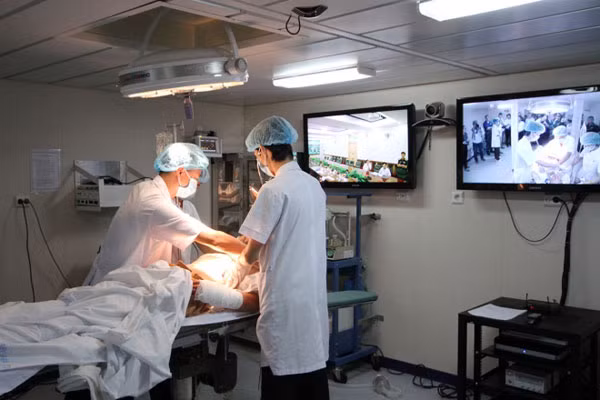 Một bệnh nhân phải phẫu thuật được các bác sĩ trên tàu Bệnh viện Khánh Hoà nối cầu truyền hình với Bệnh viện Quân y 175 TP.HCM để có phương án phẫu thuật hiệu quả nhất.