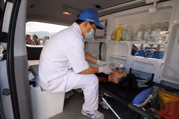 Một số bệnh nhân được chuyển lên xe cứu thương để các bác sĩ theo dõi, đưa vào Bệnh viện Đa khoa Đà Nẵng điều trị.