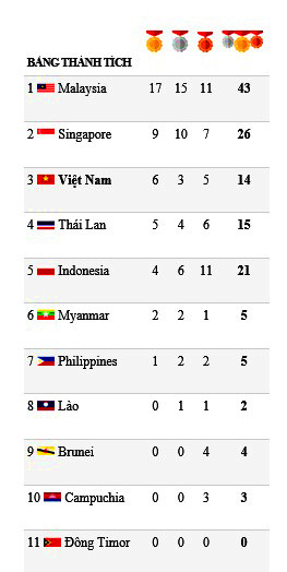 Hai vị trí dẫn đầu bảng tổng sắp là Singapore (9 HCV) và chủ nhà Malaysia (17 HCV). Thứ hạng các đoàn dự báo còn nhiều thay đổi khi từ này tới tối còn rất nhiều nội dung tranh chấp HCV.