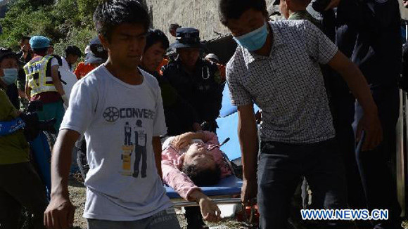 Nhà chức trách địa phương ngày 10-8 cho biết, chiếc xe buýt chở 50 người đã rơi khỏi vách đá cao hơn 10m sau khi đâm vào chiếc xe hơi thể thao và chiếc xe tải nhỏ vào lúc 16h25 chiều 9-8 trên Quốc lộ số 318 thuộc huyện Nyemo. Hành khách trên xe buýt chủ yếu là khách du lịch đến từ tỉnh An Huy, Sơn Đông, Hà Bắc và thành phố Thượng Hải. Những người bị thương hiện đang được điều trị tại bệnh viện ở Lhasa, thủ phủ khu tự trị Tây Tạng, với vết thương không nguy hiểm đến tính mạng. Nguyên nhân vụ việc đang được điều tra.