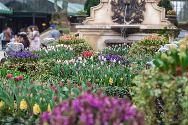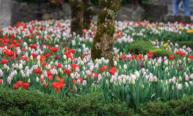 Mỗi khu vực vườn hoa Le Jardin hay quảng trường Du Dôme… hoa tulip lại được kết tạo thành những tiểu cảnh đẹp như cổ tích.