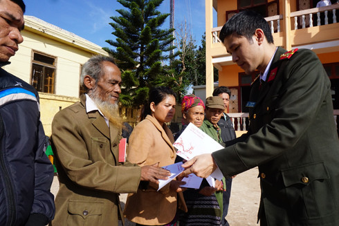 Đại úy Vũ Mạnh Hùng, Phó Tổng biên tập Báo ANTĐ trao tặng quà Tết cho đồng bào nghèo xã Hướng Phùng