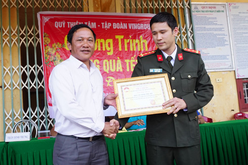 Ông Trần Đức Trung, Chủ tịch UBMTTQ huyện Hướng Hóa trao tặng thư cảm ơn cho Đại úy Vũ Mạnh Hùng, đại diện đoàn công tác Báo ANTĐ