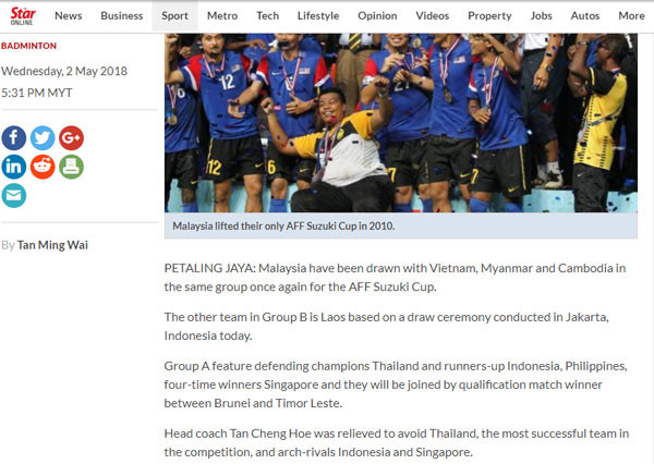 Tờ The Star (Malaysia) có bài viết bày tỏ sự hứng khởi khi lá thăm đưa đội tuyển quốc gia nước này vào bảng đấu được đánh giá là khá dễ chịu, tránh được cả đương kim vô địch Thái Lan lẫn Á quân Indonesia. "Malaysia cầm chắc vé đi tiếp, thậm chí là giành ngôi nhất bảng A", The Star nhận định.