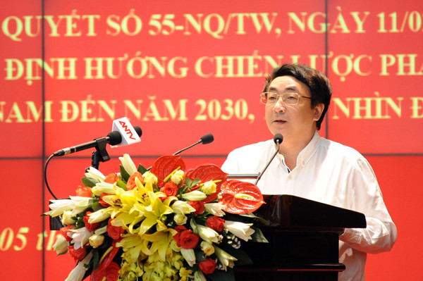 Ông Nguyễn Ngọc Trung, Phó Vụ trưởng Phụ trách Vụ Công nghiệp, Ban Kinh tế Trung ương truyền đạt những nội dung cơ bản Nghị quyết 55 của Bộ Chính trị