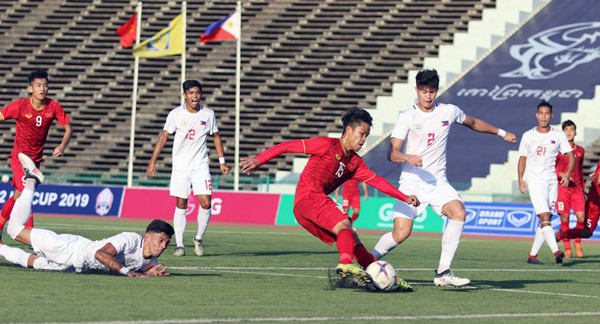 U22 Việt Nam (áo đỏ) thắng nhọc đối thủ yếu là Philippines.