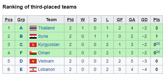 Một thông tin tích cực là hiện đang có tới 4 đội hang ba cùng 0 điểm và thậm chí hai đội xếp trên cùng là Thái Lan (3 điểm, -2) và Syria (1 điểm) cũng vẫn có thể bị loại bởi các đội nhóm dưới, nếu không đạt kết quả tốt ở lượt trận cuối.