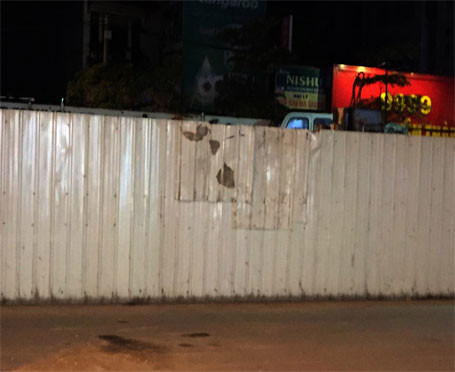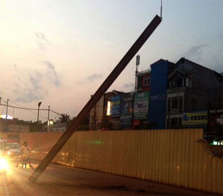 Cũng theo nhân chứng trên, thời điểm thanh sắt rơi, 1 đầu nằm chắn ngang gần hết 1 làn đường xe lưu thông; còn đầu kia “xé toạc” 1 đoạn tấm rào chắn bằng tôn và vẫn gác lên đó. Chỉ trong “nháy mắt” công nhân đã vội vã thu dọn hiện trường và cho người “vá” ngay tấm tôn rào chắn bị rách.
