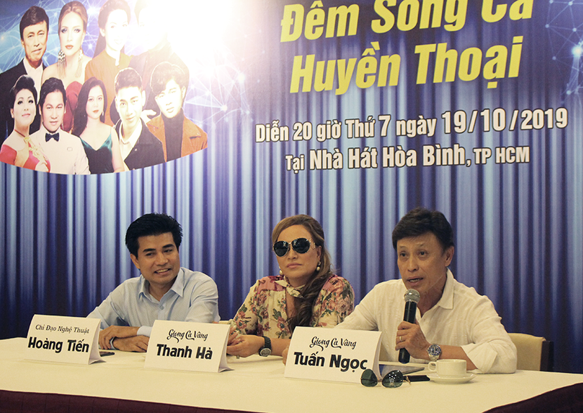 Thanh Hà xuất hiện tại buổi họp báo công bố chương trình "Đêm song ca huyền thoại" diễn ra vào tối 19-10 tới tại Nhà hát Hòa Bình, TP.HCM. Từ trái qua: chỉ đạo nghệ thuật Hoàng Tiến, danh ca Thanh Hà, danh ca Tuấn Ngọc.