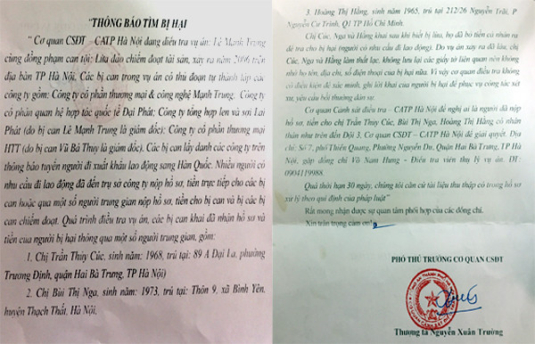 Nội dung thông báo tìm bị hại của Cơ quan CSĐT - CATP Hà Nội