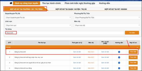 VD: Thủ tục: Đăng ký khai sinh/ click: Thực hiện