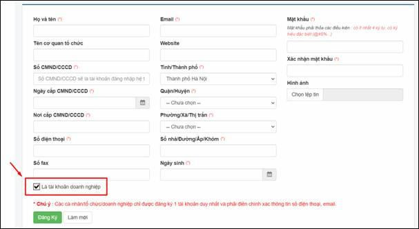 Nếu là Tổ chức/doanh nghiệp tích vào nút: Là tài khoản doanh nghiệp