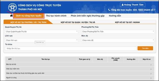 Bước 2: Chọn: Dịch vụ công trực tuyến/ Nộp hồ sơ tại Phường/xã/thị trấn