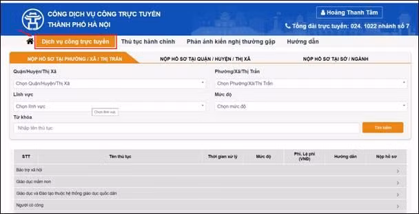 Bước 1: Công dân Đăng nhập vào cổng DVC Hà Nội có địa chỉ:https://dichvucong.hanoi.gov.vn/