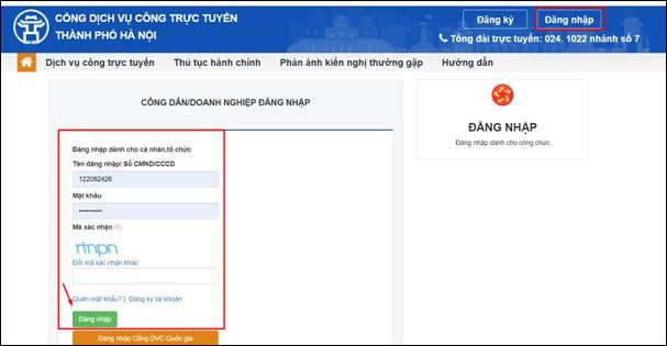 Công dân/ Doanh nghiệp đăng nhập tài khoản bằng tài khoản đã đăng ký của Cổng DVC Hà Nội hoặc Đăng nhập bằng tài khoản đã đăng ký của Cổng DVC Quốc gia