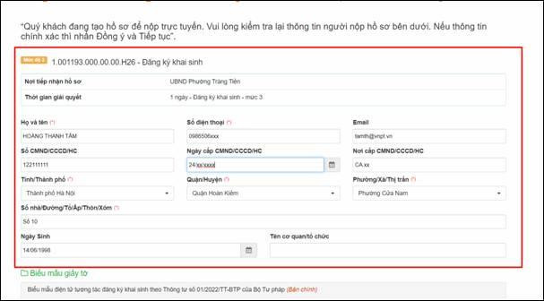 Bước 5: Công dân Đồng ý và tiếp tục, hệ thống sẽ check trong kho dân cư để fill thông tin vào form người nộp với các trường dữ liệu: họ và tên, ngày tháng năm sinh, số CCCD, địa chỉ thường trú.