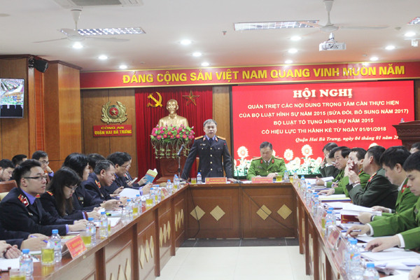 Khai mạc hội nghị, Đại tá Đinh Huy Hoàng, Trưởng CAQ Hai Bà Trưng nêu rõ, Bộ luật Hình sự năm 2015 là một trong những bộ luật hết sức quan trọng, liên quan trực tiếp đến hoạt động của lực lượng công an. Ngày 20/6/2017, tại kỳ họp thứ 3 Quốc hội khóa XIV đã thông qua Luật số 12 sửa đổi, bổ sung một số điều của Bộ luật Hình sự năm 2015; Nghị quyết số 41 về hiệu lực thi hành Bộ luật Hình sự năm 2015 đã được sửa đổi, bổ sung năm 2017 có hiệu lực thi hành từ 1-1-2018.