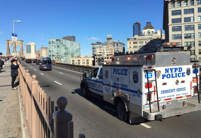 Chiếc xe của Sở Cảnh sát Neww York, theo sau là một đoàn xe thực thi pháp luật liên bang có vũ trang chở Joaquin Guzman trở lại nhà tù ở Manhattan sau một phiên điều trần.