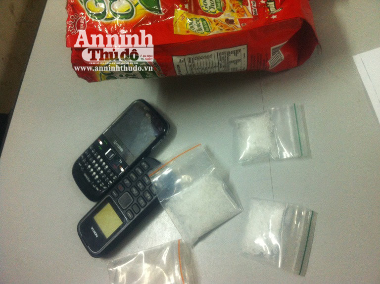 Qua đó phát hiện trong gói kẹo có lẫn 3 gói ni-lon, chứa tinh thể màu trắng (xác định là ma túy).