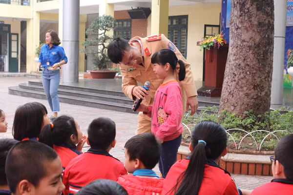 Học sinh trường Tiểu học Nguyễn Khả Trạc hào hứng tham gia đối thoại trong buổi tuyên truyền về an toàn giao thông