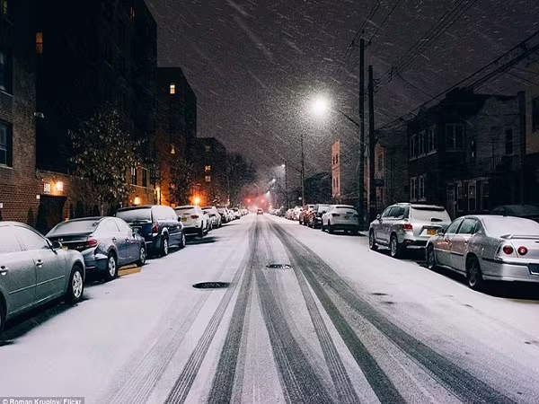 Tuyết phủ trắng xóa ở một con phố ở Brooklyn