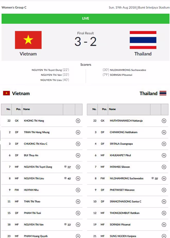 Danh sách đội hình và kết quả trận Việt Nam - Thái Lan, môn bóng đá nữ ASIAD 2018