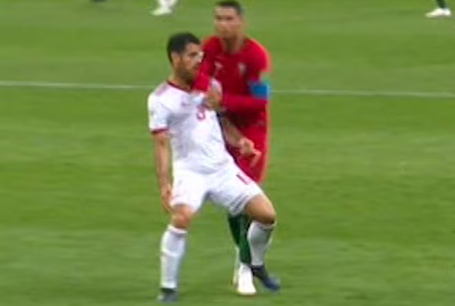 Phút 80 trận Bồ Đào Nha và Iran, tiền đạo Cristiano Ronaldo đã có hành vi đánh cùi chỏ vào mặt của hậu vệ Morteza Pouraliganji của Iran.