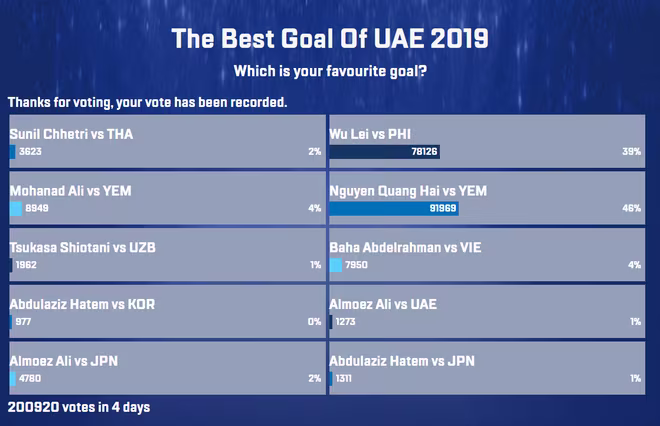 Cuộc bình chọn bàn thắng đẹp nhất Asian Cup 2019 sẽ kết thúc vào ngày mai, 7-2.