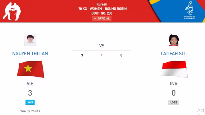 Nguyễn Thị Lan thắng áp đảo đối thủ người Indonesia để mang về tấm HCV thứ 4 trong ngày cho kurash Việt Nam