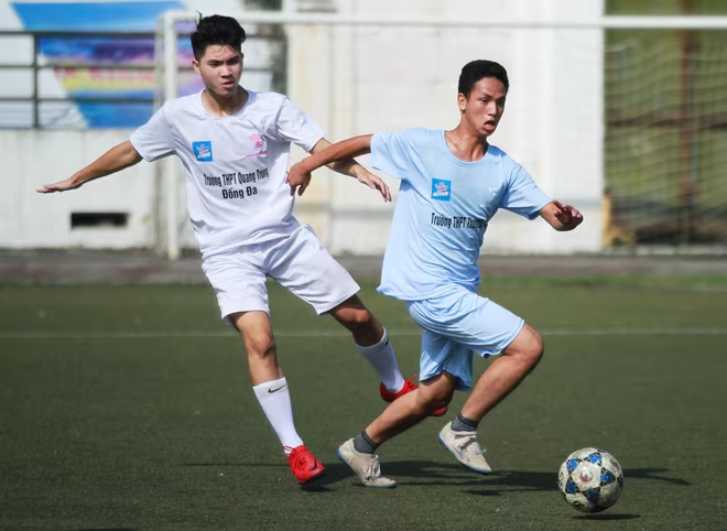Minh Hiếu (trái) xuất sắc lập hattrick cho THPT Quang Trung-Đống Đa