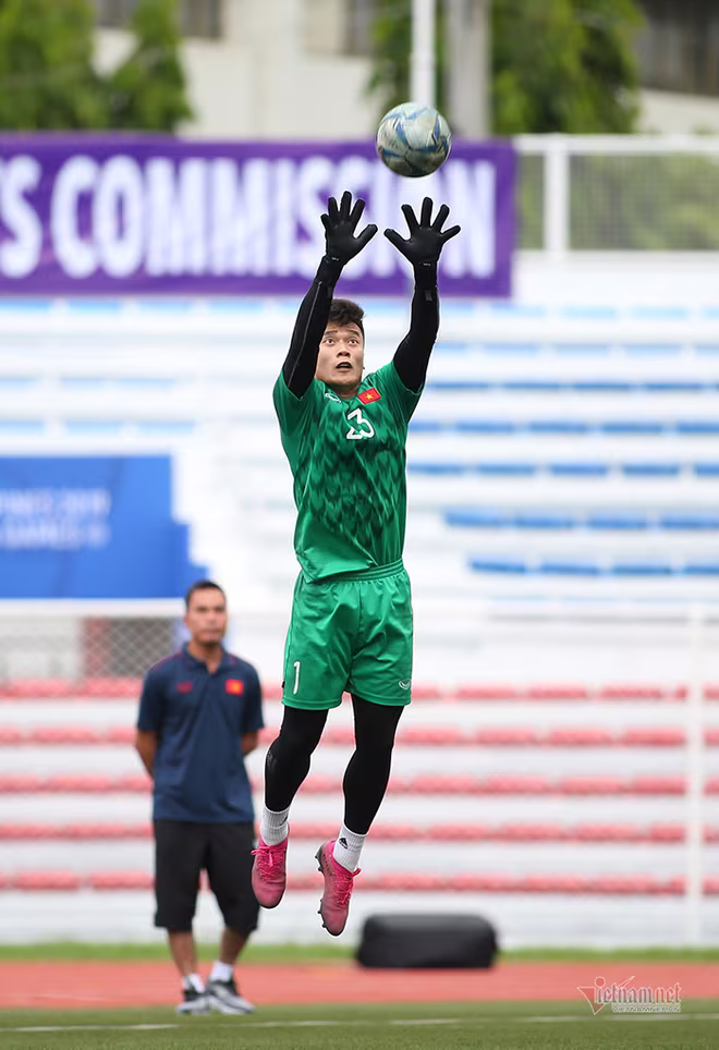 Không phải tới bây giờ, người ta mới thấy thủ thành của tuyển U22 Việt Nam có những pha bắt bóng lập bập "toát mồ hôi". Ảnh: TTXVN
